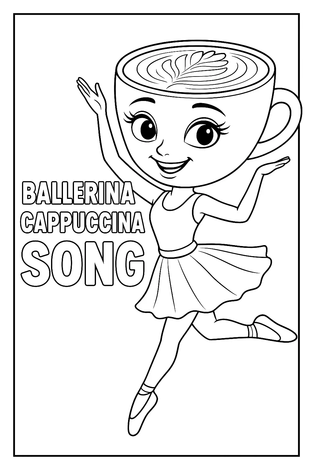 This is a black - and - white line drawing of Ballerina Cappuccina from Italian brainrot, a character with a teacup - shaped head, wearing a ballet outfit, and showing a cheerful expression.