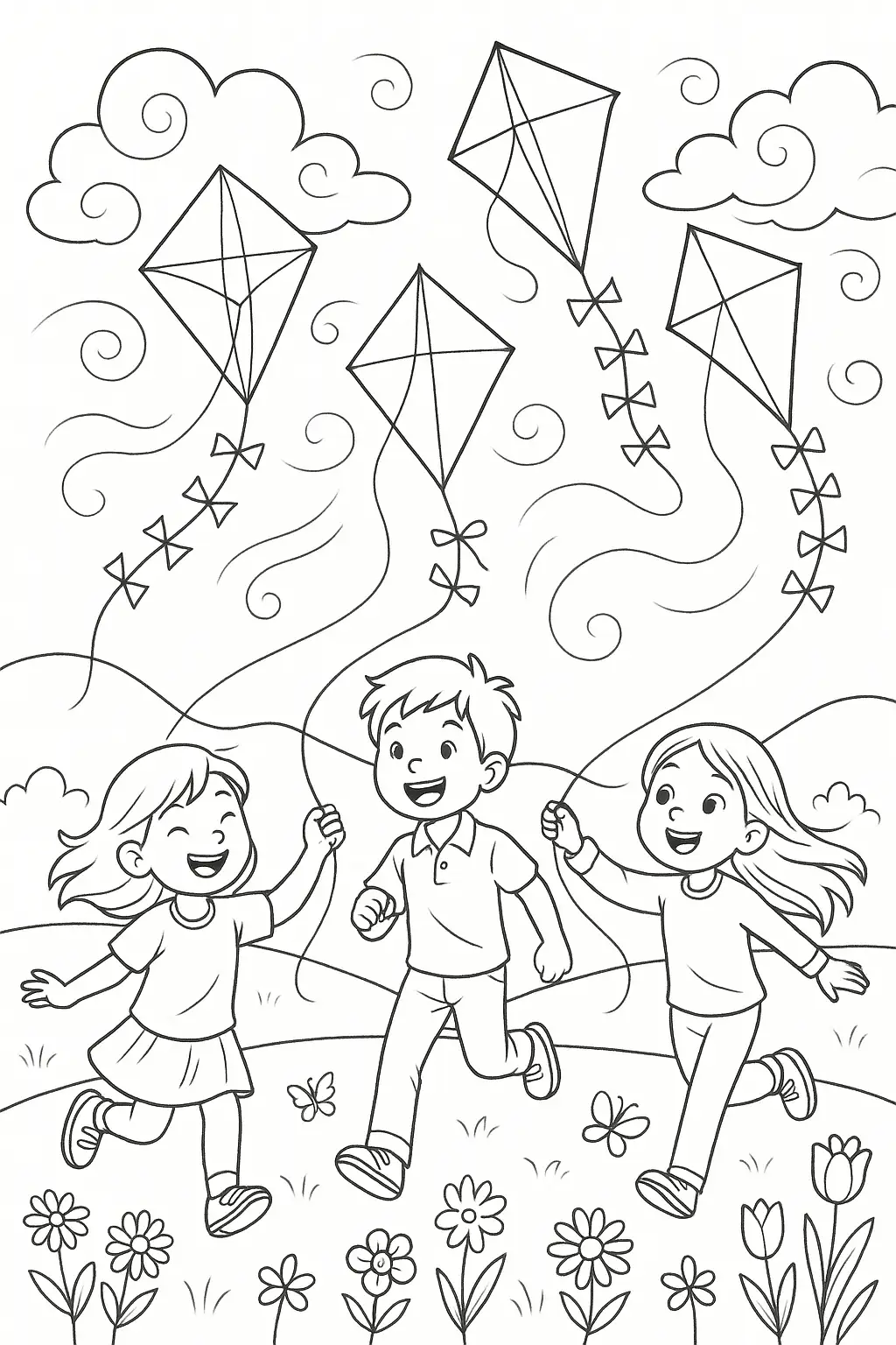 generate an uncolored coloring page of children flying kites in a breezy spring meadow